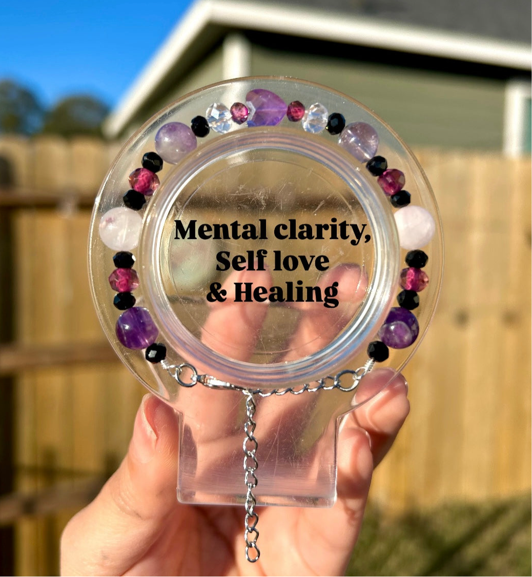 The Amethyst/Rose Quartz Bracelet features an adjustable design incorporating both amethyst and rose quartz gemstones. Amethyst is known for its potential to promote calmness and clarity, while rose quartz is associated with emotional healing and love. This combination may enhance emotional well-being and provide a balanced aesthetic.