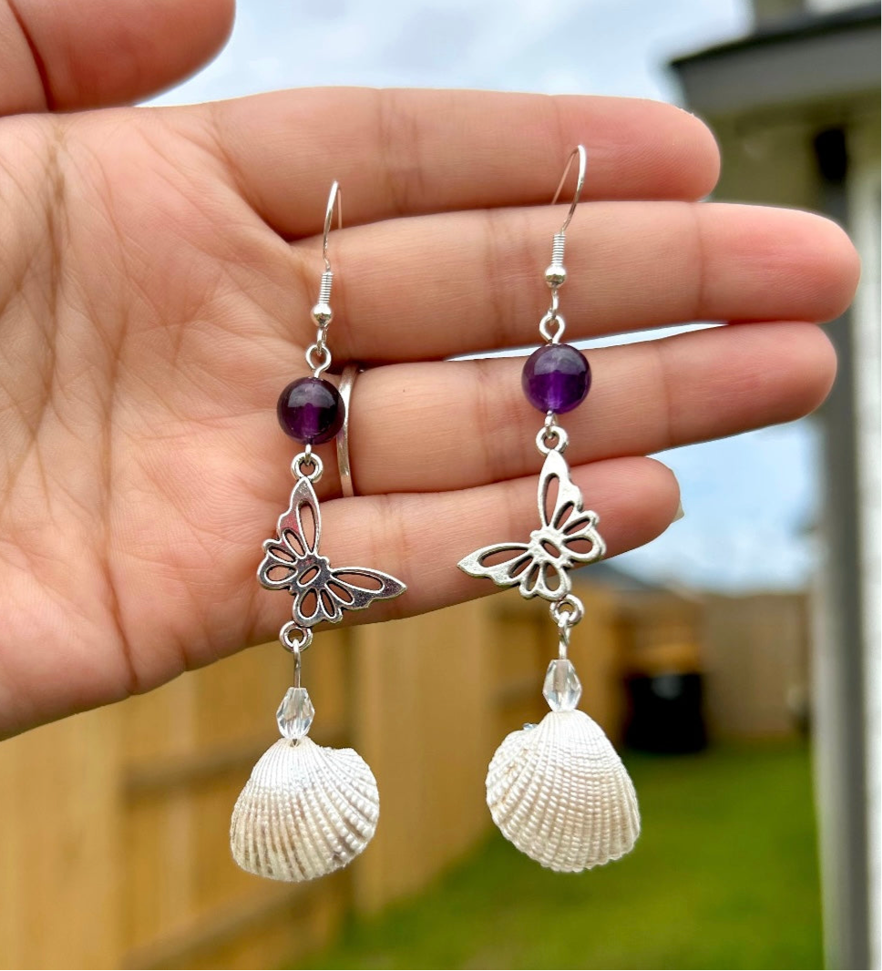 Expertly crafted Butterfly Sea Earrings are a beautiful combination of amethyst stones, real seashells, and delicate butterfly charms. The dangle design adds a touch of elegance to any outfit. Make a statement and embrace your love for nature with these unique earrings.