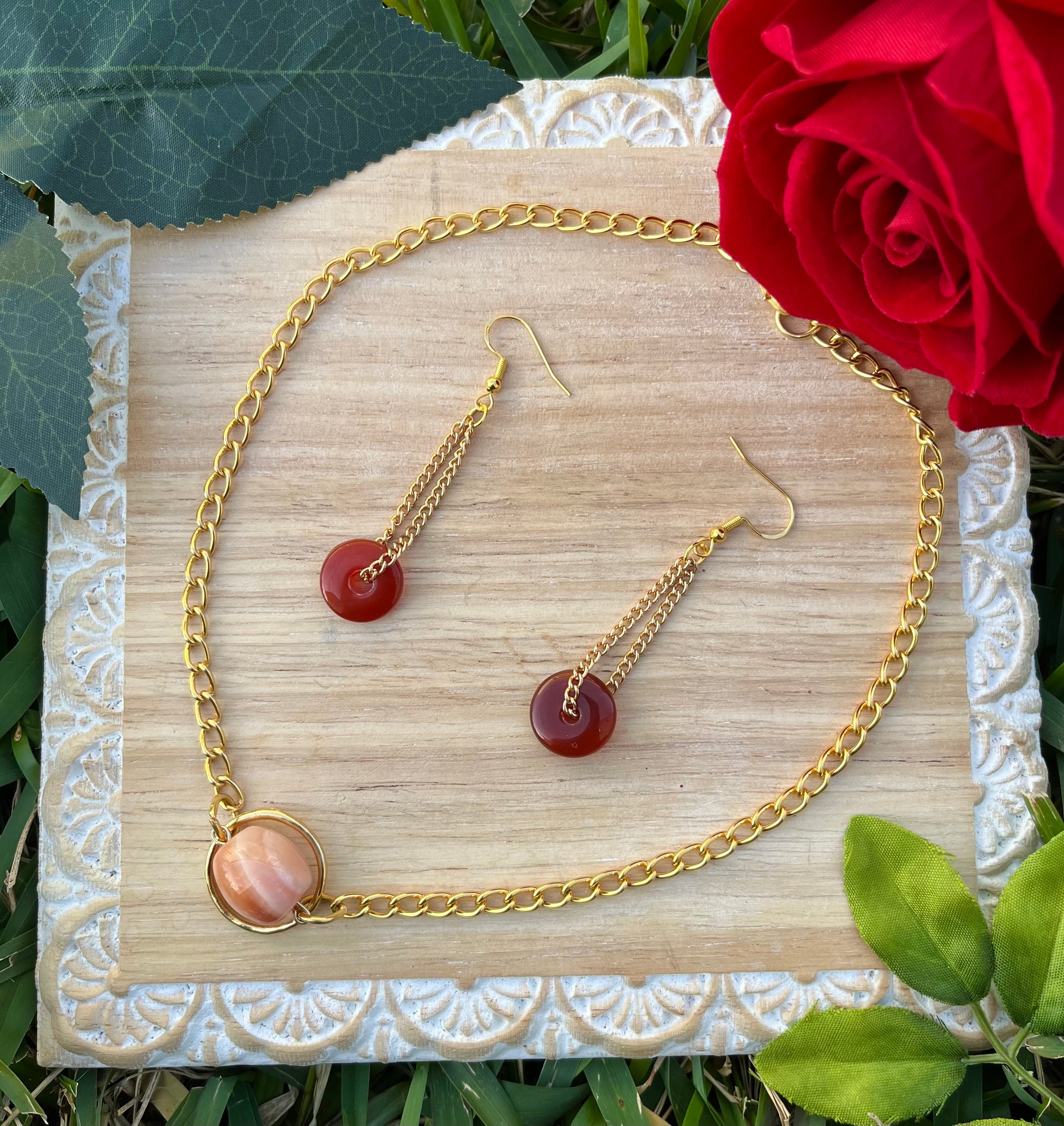 This jewelry set comes with an 18k gold plated adjustable necklace with genuine carnelian crystals and dangle earrings with genuine carnelian crystals.
