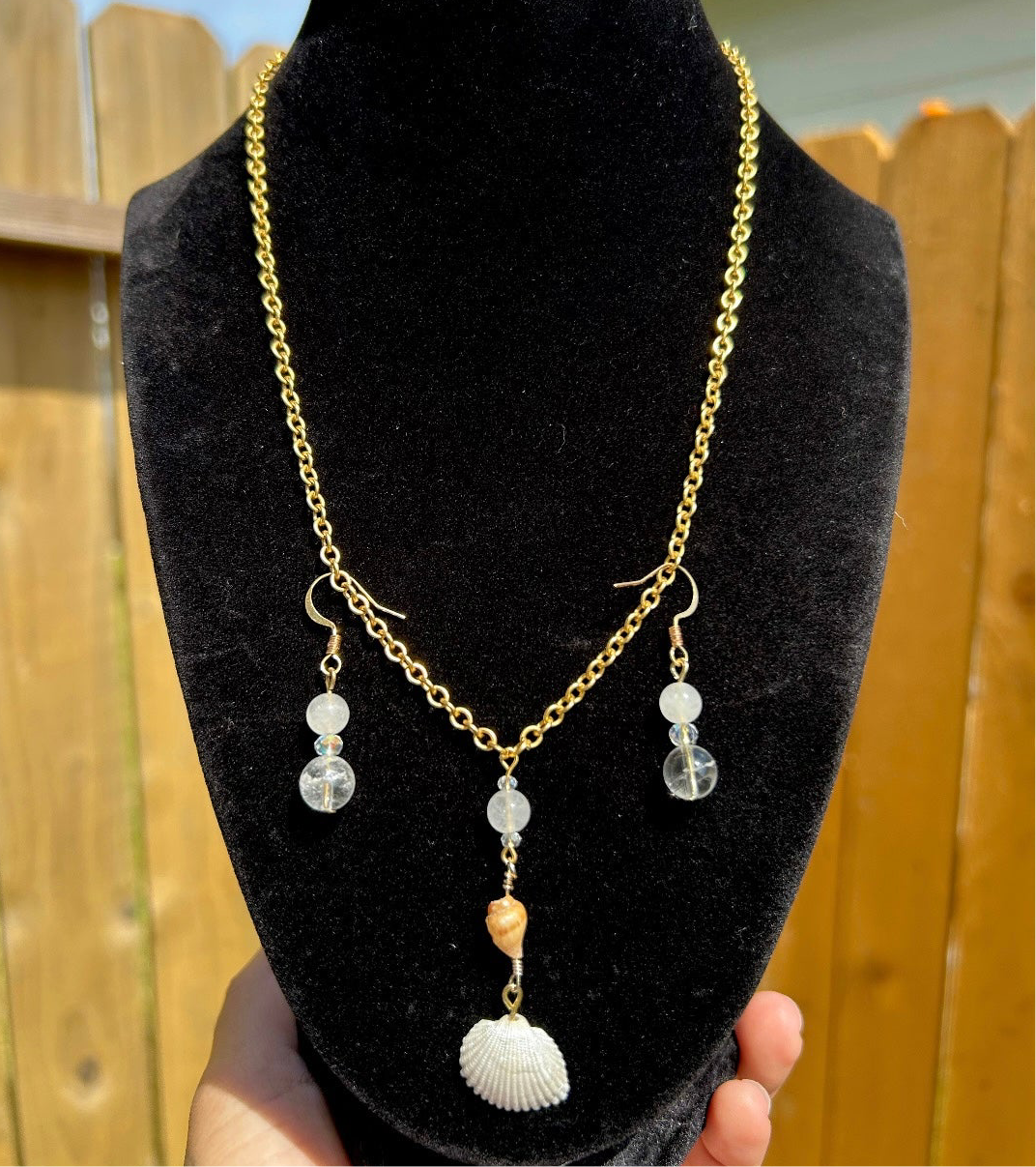 Experience the elegant beauty of the sea with our Love of The Sea Jewelry Set. Each piece features real seashells and clear quartz crystals, symbolizing the natural treasures found in the ocean. The adjustable 18k gold chain ensures a perfect fit for all, making this set a versatile addition to any wardrobe. Elevate your style with this stunning earrings and necklace set.