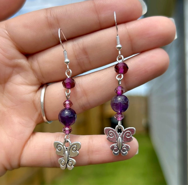 "Add a touch of elegance to your wardrobe with our Mariposa Earrings featuring stunning Amethyst stones and delicate butterfly charms. The dangle design adds movement and charm to any outfit. Elevate your look with the beauty of nature."