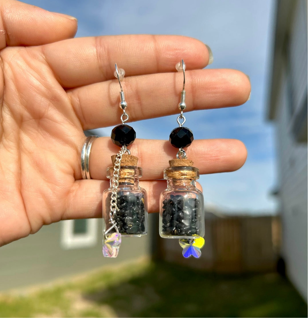 Handcrafted with a glass bottle, filled with genuine black obsidian crystal chips and glass beads, these earrings have a drop length of 1.5in.