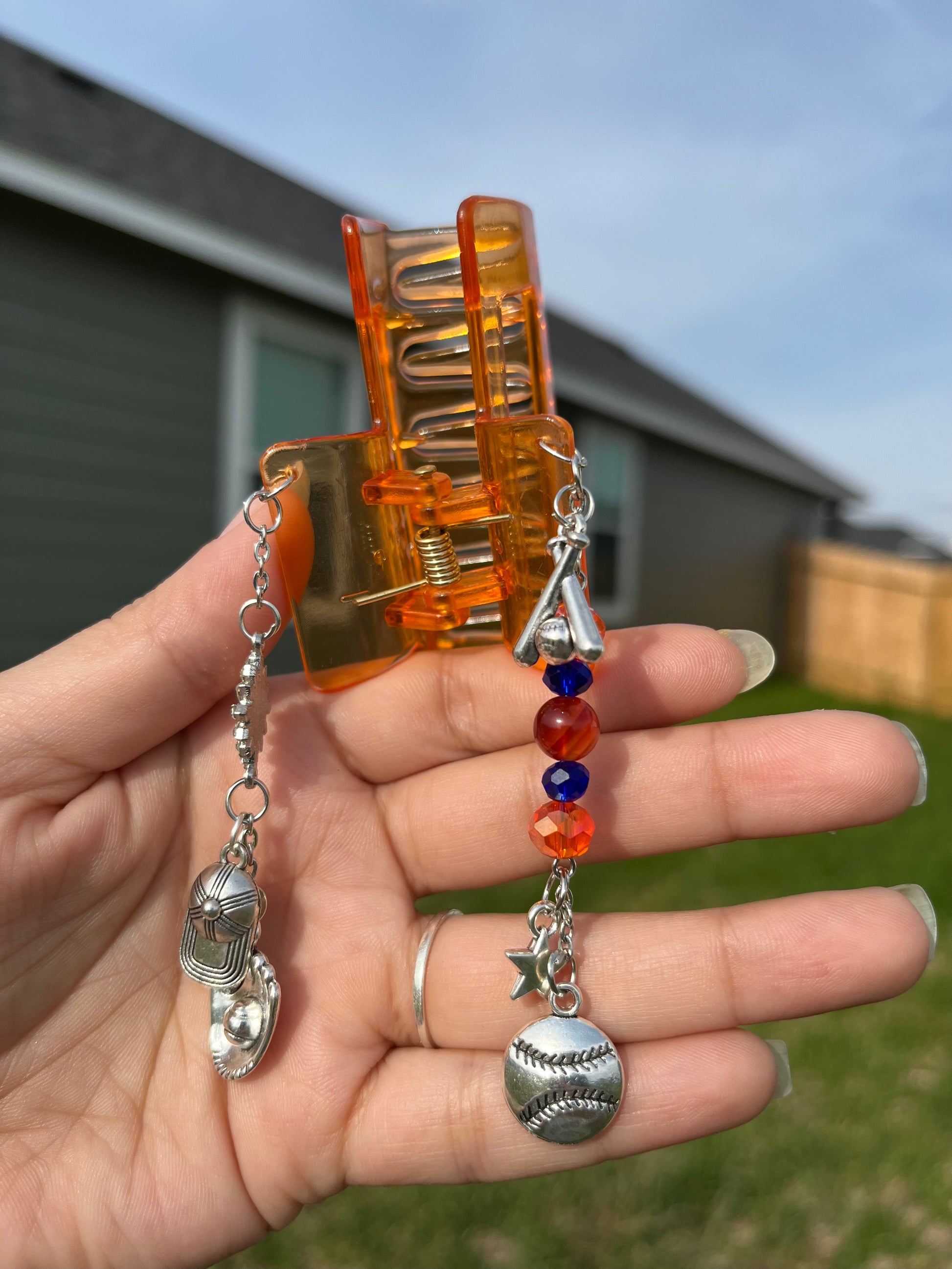 An acrylic hair clip with sterling silver charms, glass beads and genuine carnelian crystals.