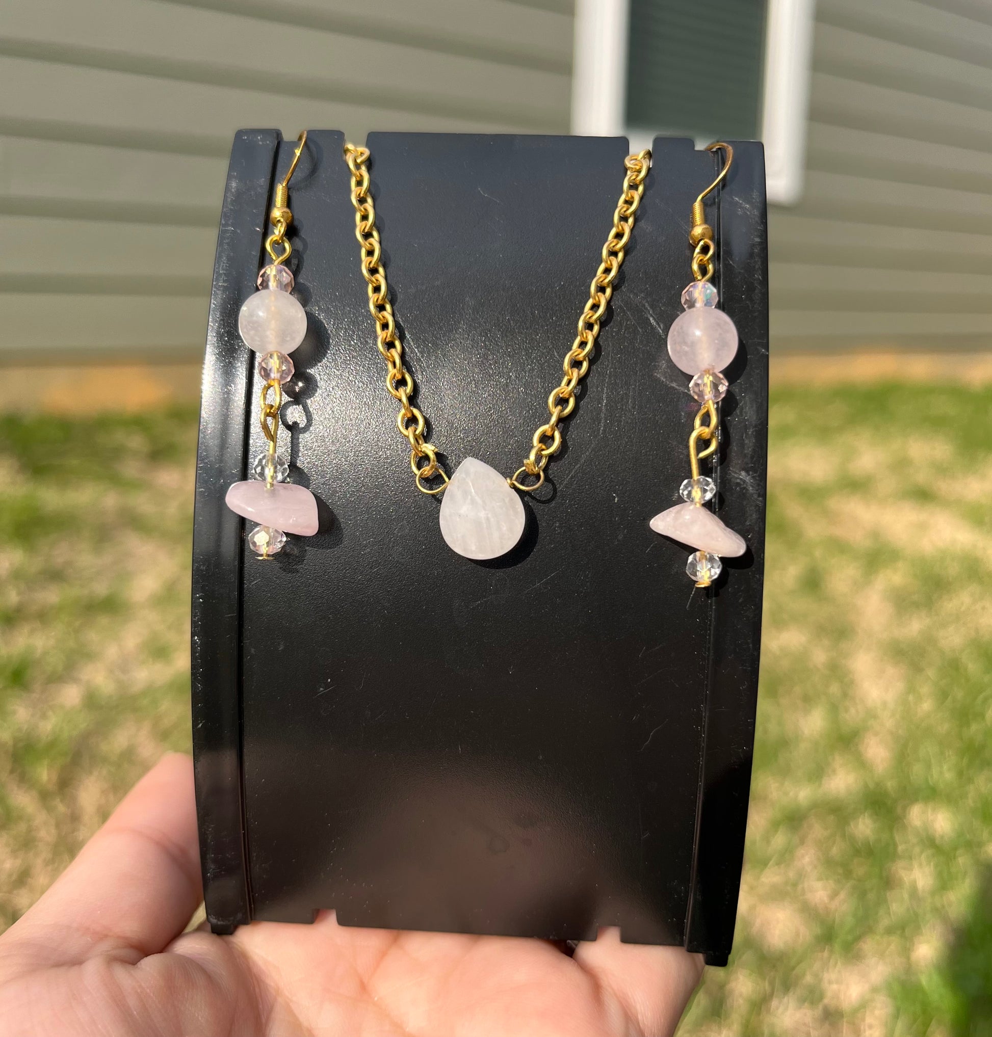 This jewelry set includes an adjustable 18k gold plated necklace with a genuine rose quartz crystal and 18k gold plated earrings with genuine rose quartz crystals.