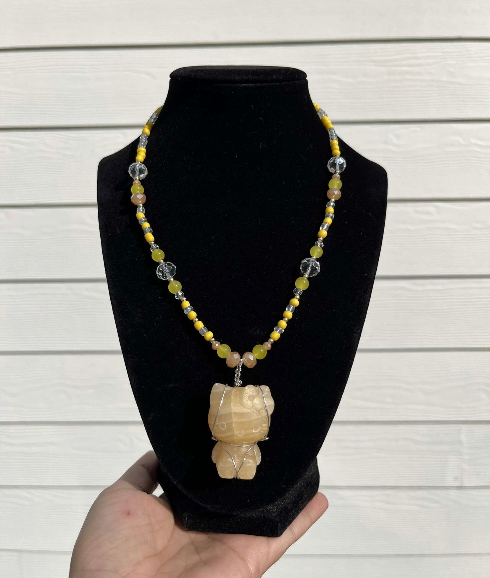 Glass beads and genuine yellow calcite crystals on an adjustable necklace with a wire-wrapped yellow calcite hello kitty.